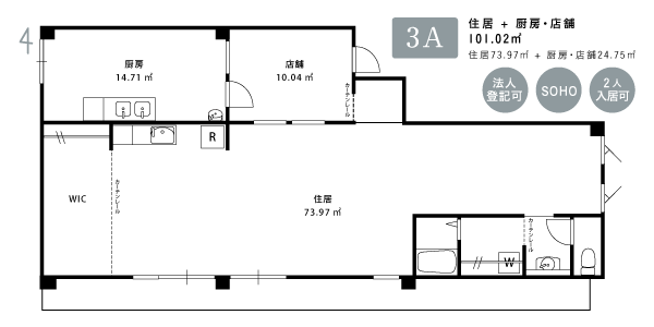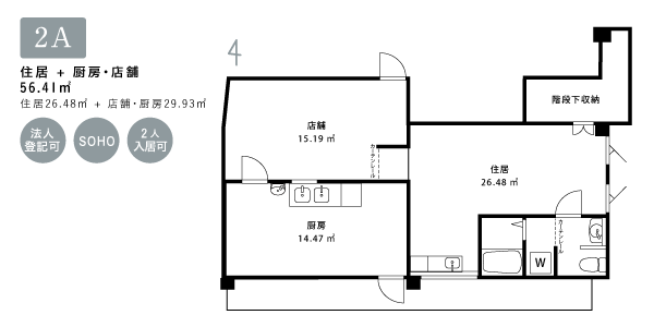 3Aより住居空間がコンパクトな菓子製造業許可の申請ができるキッチン室と販売スペースを備えた店舗付き兼用住居です。1人または2人入居でミニマルでシンプルな生活が送れます。