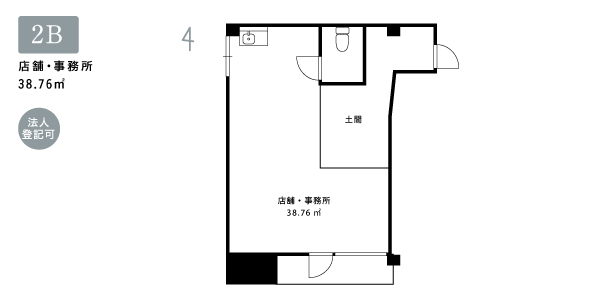 入口側に販売店舗や事務所の商談スペースとして活用できる土間付きのオフィス・店舗用の区画です。フリーランスや開業を考えている士業、SE、デザイナーなどの事務所としてやクリエイターのアトリエ、販売店舗に。